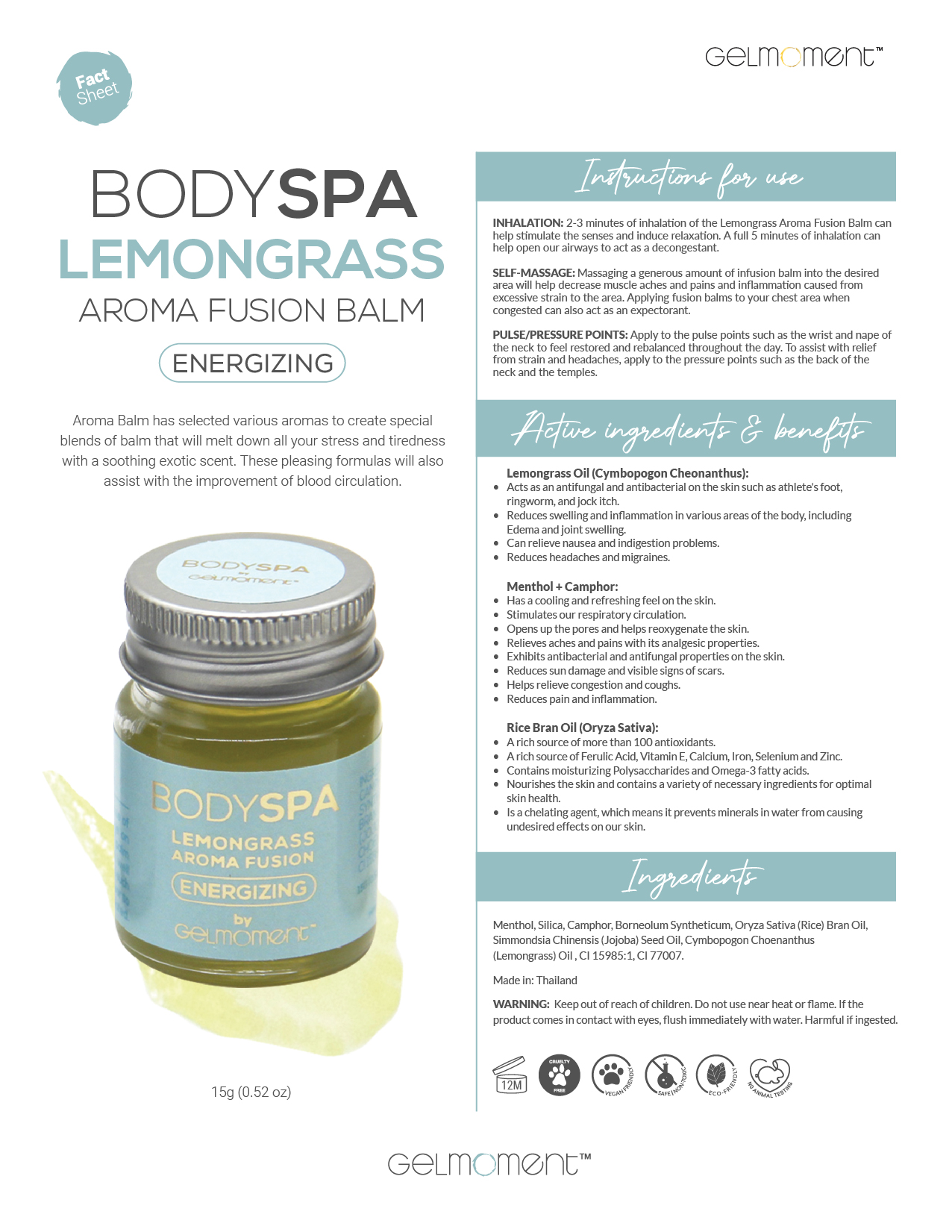 Lemongrass Aroma Balm has selected various aromas to create special blends of balm that will melt down all your stress and tiredness with a soothing exotic scent. These pleasing formulas will also help improve your blood circulation.