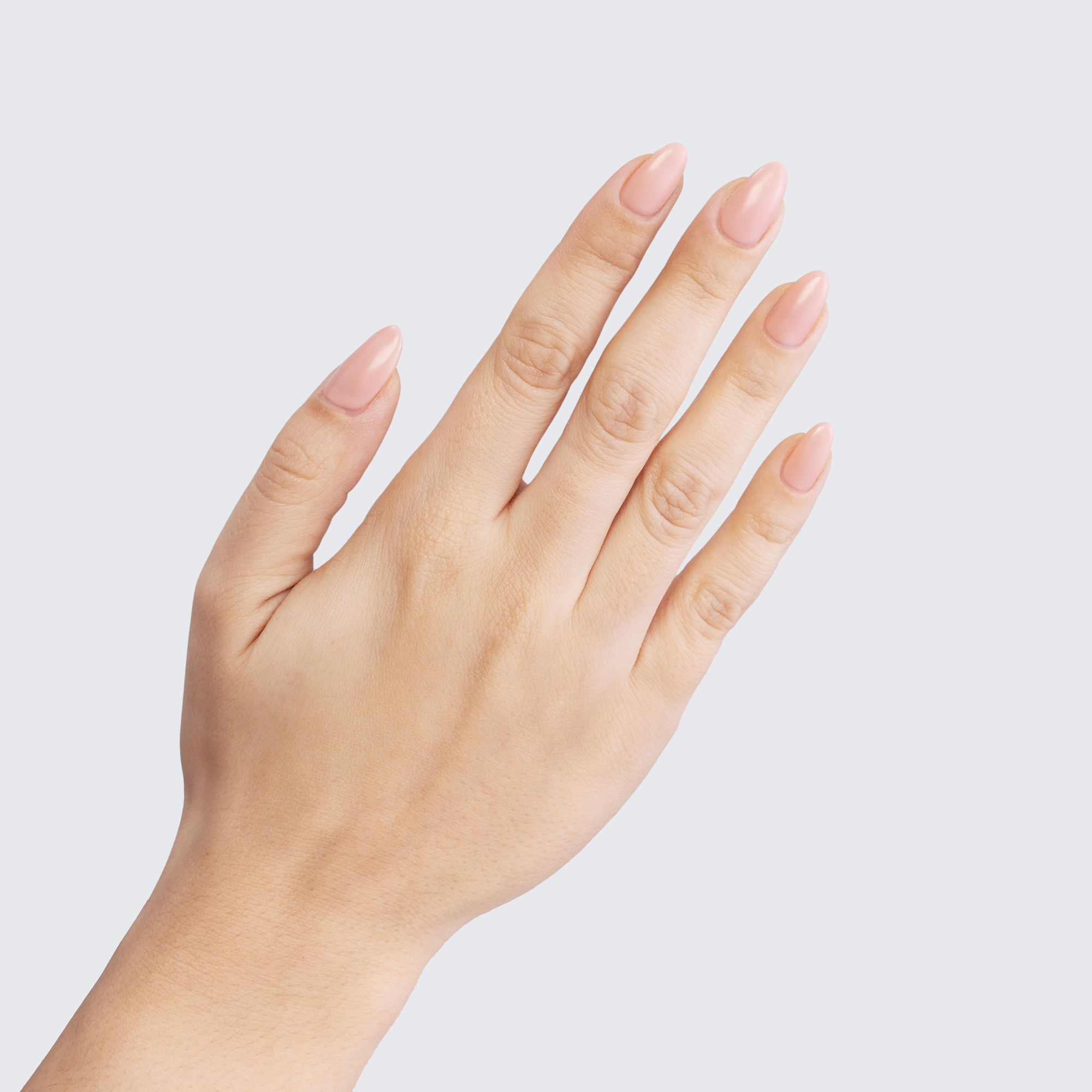 Pale pink. Opaque. Semi-matte finish. Warm undertone.