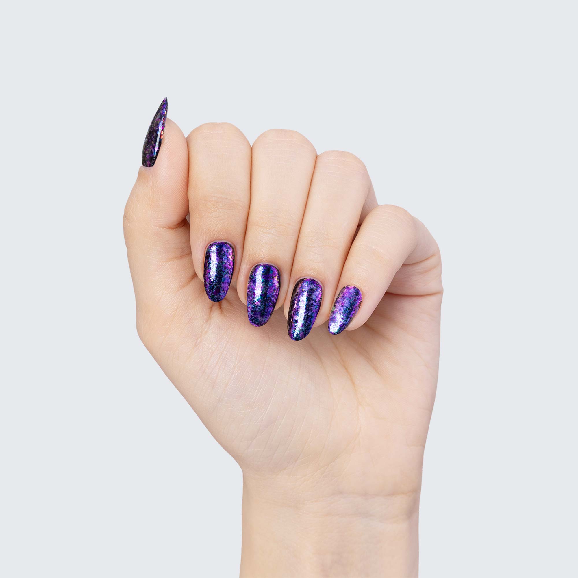 The ethereal allure of PRECIOUS FLAKES makes them a marvelous choice for manicures whose beauty can outreach any stretch of imagination. Because they are semi-translucent, each individual colour scheme takes on surprisingly varied hues depending on which gel polish you use as a base.