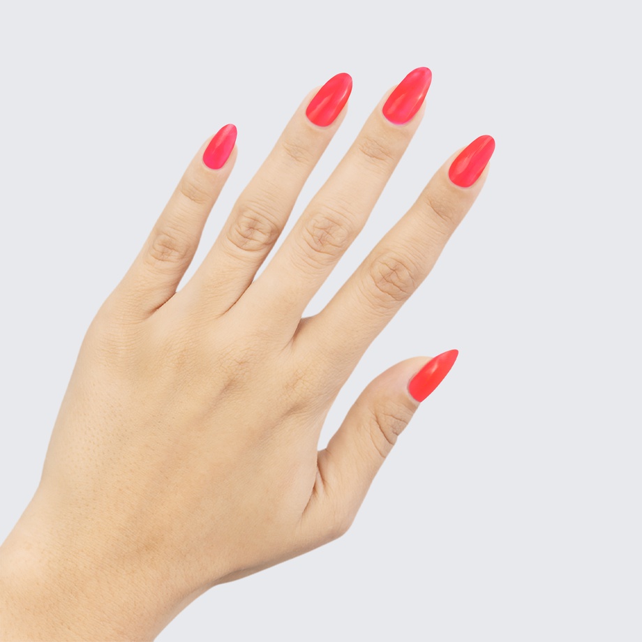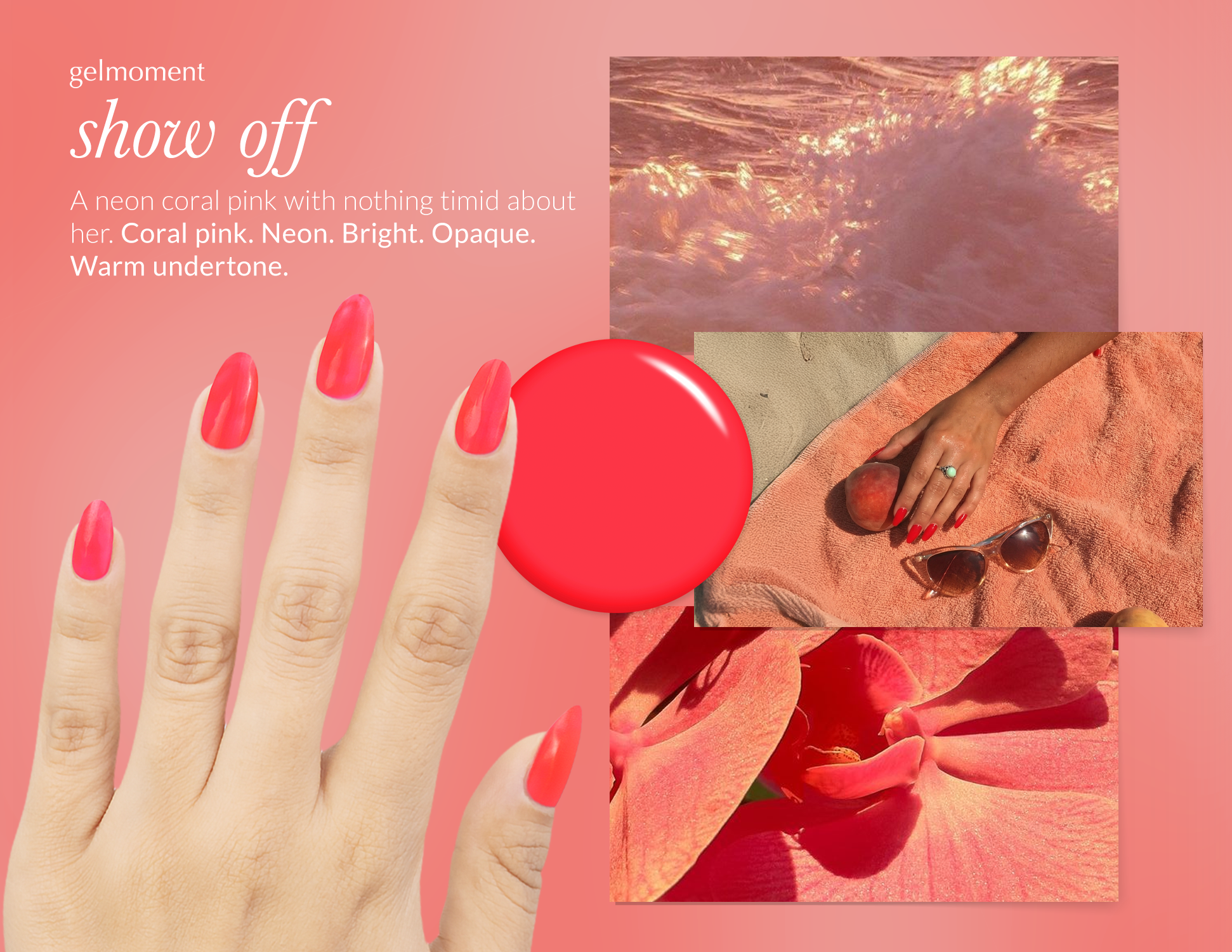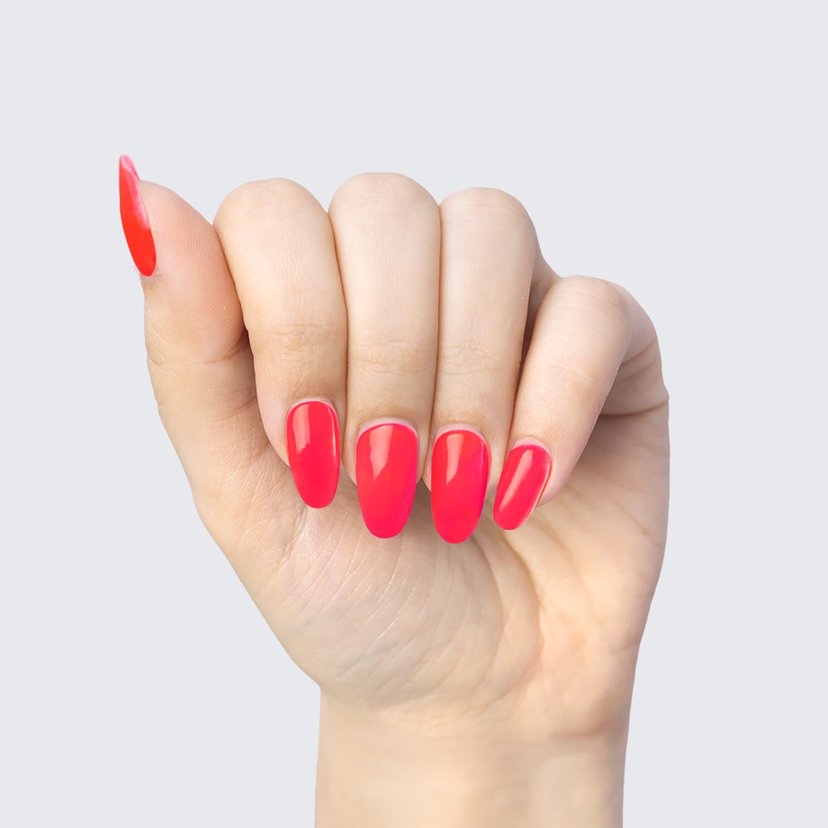 Coral pink. Neon. Bright. Opaque. Warm undertone.